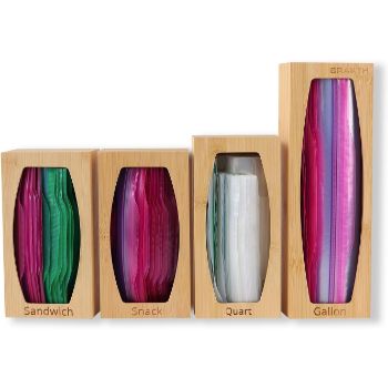 - Set of 4 individual bamboo boxes for different bag sizes: gallon, quart, sandwich, and snack
