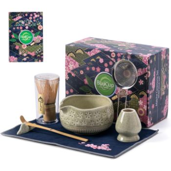 - Includes 7 essential pieces: ceramic bowl with spout, bamboo whisk, scoop, sifter, ceramic holders, and tea cloth