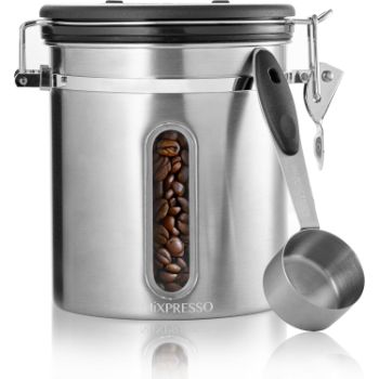 Mixpresso 16oz Coffee Canister with Window is a sleek stainless steel container built to preserve the rich aroma and taste of your coffee. Featuring an airtight clamp seal, one-way CO2 valve, and BPA-free silicone gasket, it effectively keeps air and moisture out. Its clear viewing window lets you see the coffee level without opening the lid, while a date tracker on top helps you monitor freshness. With a compact size that still fits a full bag of beans and a sturdy measuring scoop included, this canister makes daily brewing easier, cleaner, and more enjoyable. It’s not just for coffee, it’s perfect for tea, sugar, spices, or flour too.