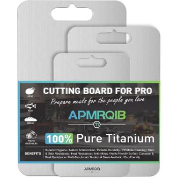 APMRQIB Titanium Cutting Board Set includes three sizes (small, medium, and large), crafted from 100% pure titanium for unmatched hygiene, durability, and long-term performance. With a double-sided design, you can easily switch between meat, vegetables, and bread prep without mixing odors or bacteria. Built from a single piece of titanium without any glue or adhesives, each board features a wire-drawn surface that resists staining and scratching. The set is dishwasher safe, non-toxic, and lightweight, offering a smarter, cleaner alternative to traditional plastic or wood boards. Whether you’re slicing, dicing, or serving charcuterie, this set is designed to elevate your everyday cooking experience.
